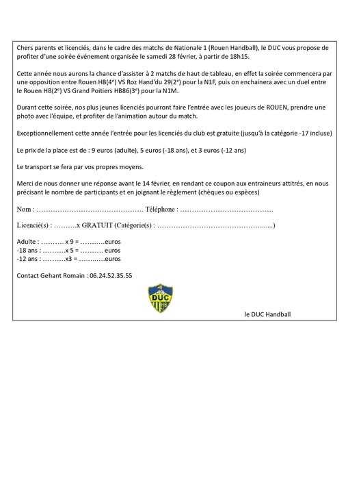 document d’inscription pour assister aux matchs au Kindarena à Rouen le samedi 28 février 2026.
